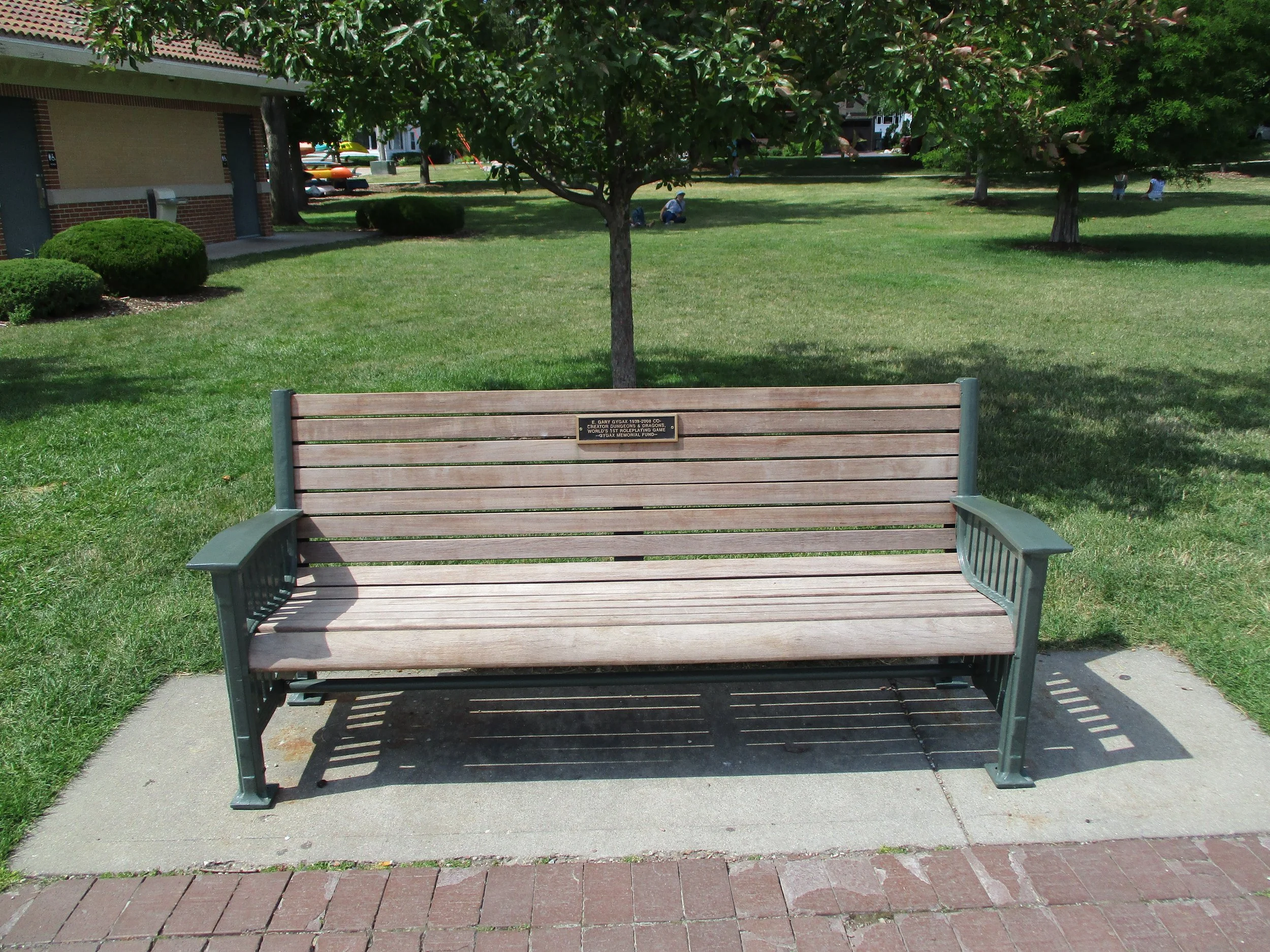 The Gygax Park Bench is situated at the far west end of Elm Park (aka, Library Park), in the spot where Gary once sat, dreaming of one day living in Stone Manor and writing fantasy novels of his own. Gary realized this dream in the mid-1980s, living in the actual mansion and writing the fantasy books that would make him a NY Times Best Selling Author several times over.